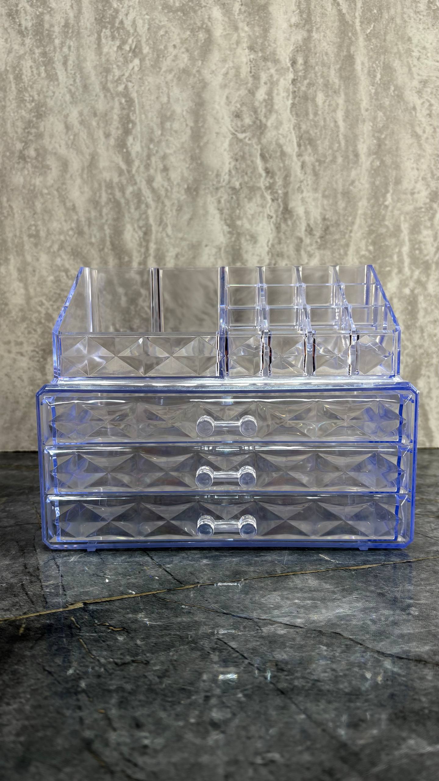 نمونه محصول: مدل سه کشو (ابعاد حدودی طول ۲۴، عرض ۱۴، ارتفاع ۱۹ سانتیمتر) که فضای کافی برای انواع لوازم آرایشی و بهداشتی فراهم میکند